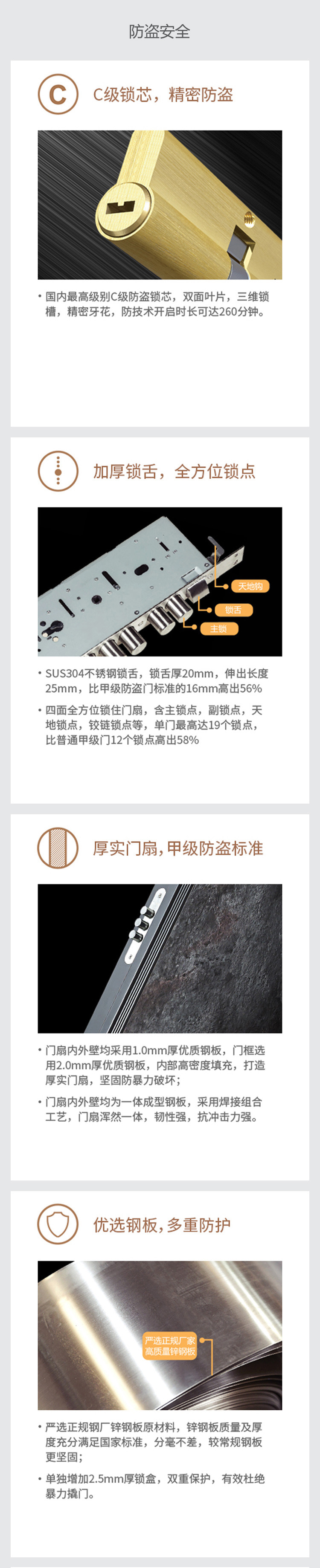 等级:甲级10公分 板材:锌合金1.0/2.0 填充:局部岩棉填充 锁体:双快双活金钢锁体 锁具:普通机械拉手 可升级为智能锁 表面:超强防晒氟碳漆 下档:双层不锈钢下档