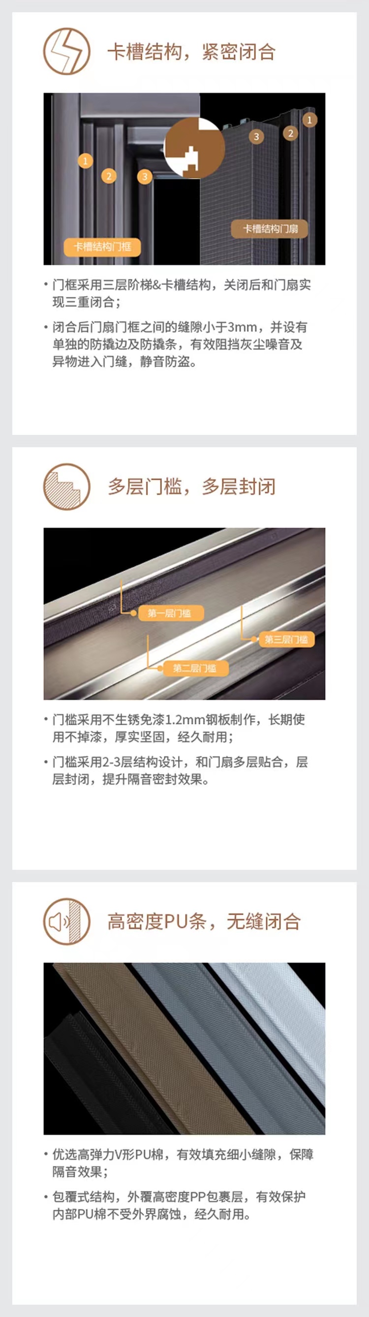 板材:锌合金1.0/2.0 填充:局部航空铝箔 锁体:双快双活金钢锁体 锁具:普通机械拉手 可升级为智能锁 表面:超强防晒氟碳漆 下档:双层不锈钢下档